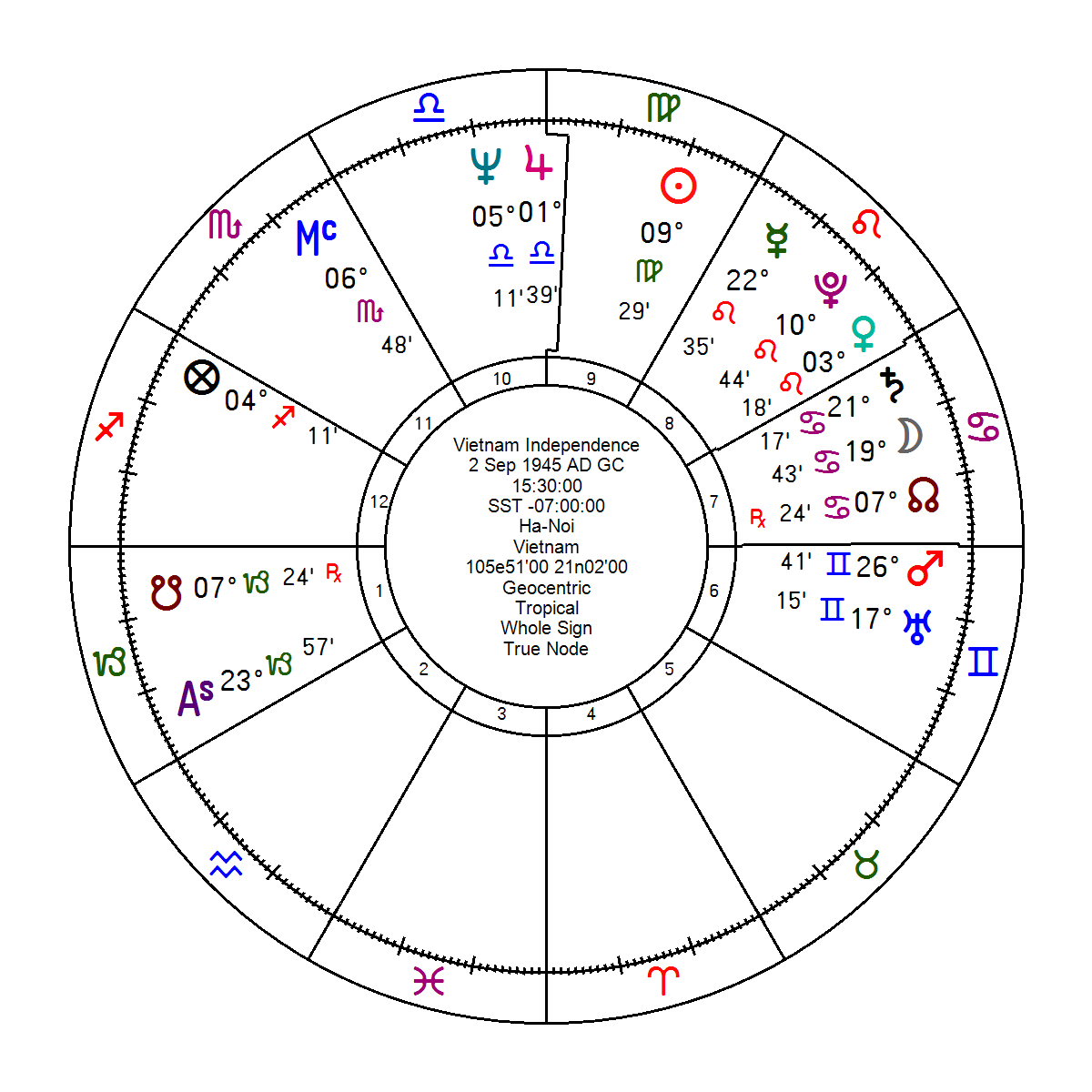 Dưới đây là lá số của nước Cộng Hòa Xã Hội Chủ Nghĩa Việt Nam, được thành lập vào ngày 2/9/1945, tại Hà Nội, lúc 15:30 chiều (giờ tuyên thệ) bởi lãnh tụ Hồ Chí Minh.