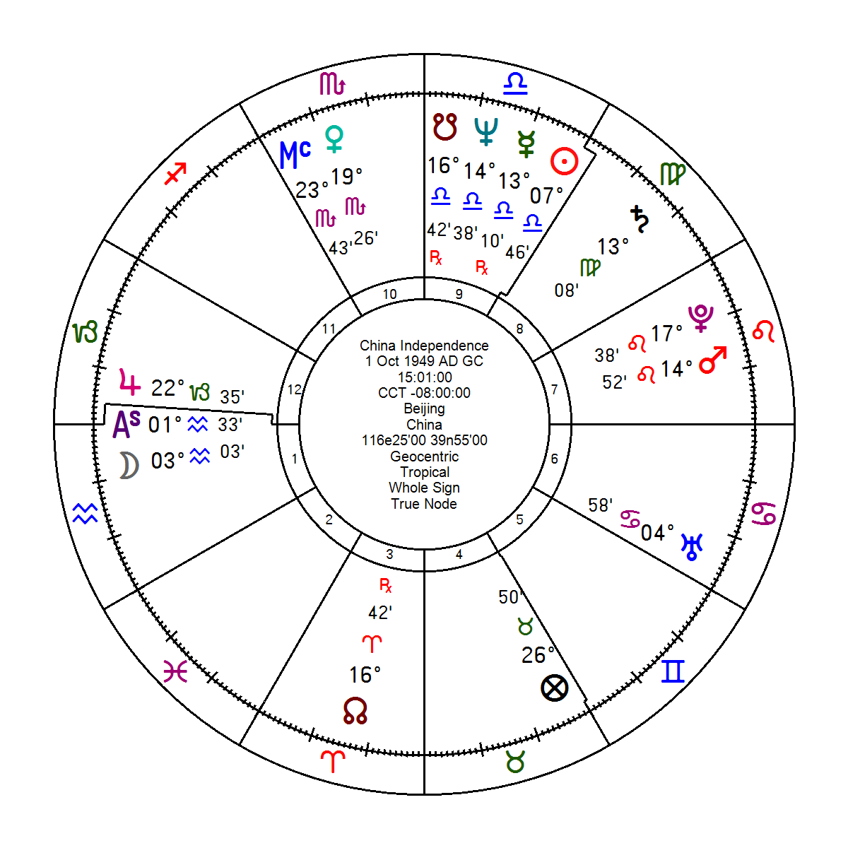 Dưới đây là lá số của nước Cộng Hòa Nhân Dân Trung Hoa, được thành lập vào ngày 1/10/1949, tại Bắc Kinh, lúc 15:01 chiều (giờ tuyên thệ) do chủ tịch Mao Trạch Đông.