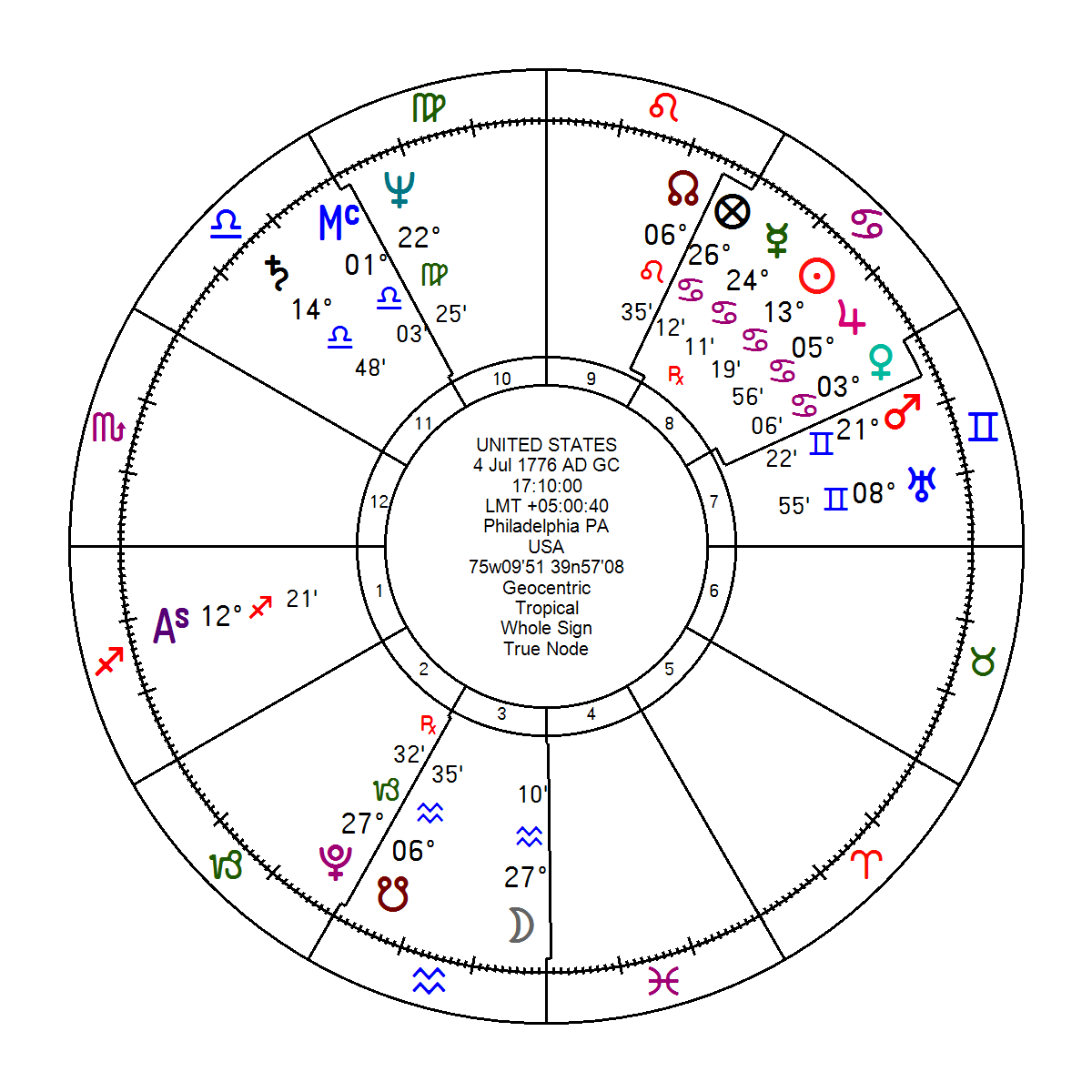 Dưới đây là lá số của Hợp chủng quốc Hoa Kỳ, được thành lập vào ngày 4/7/1776, tại Philadelphia, PA, lúc 17:11 chiều với cung Mọc trong Nhân Mã.